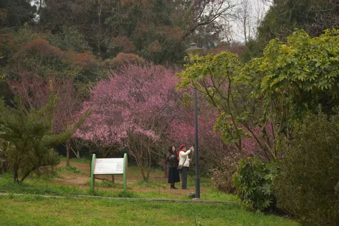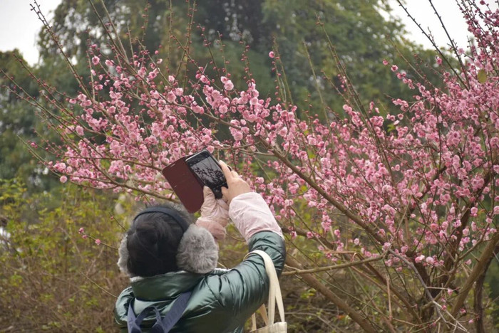 手捏手机的刘大姨穿梭在梅树间,支配寻找最好角度记载这份冬日馈遗,她说:“花开得真好,很漂亮,可惜不是好天,否则更出片。”