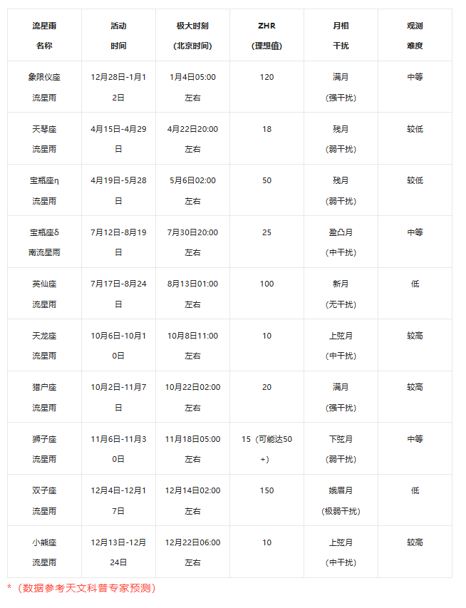 2026年共有10场主要流星雨亮相苍穹,覆盖全年12个月,其中北半球三大流星雨(象限仪座、英仙座、双子座)均有出色发达。流星雨的不雅测中枢取决于“天顶每小时流星数(ZHR)”和“月有关扰”,ZHR数值越高、蟾光烦闷越小,不雅测后果越佳。