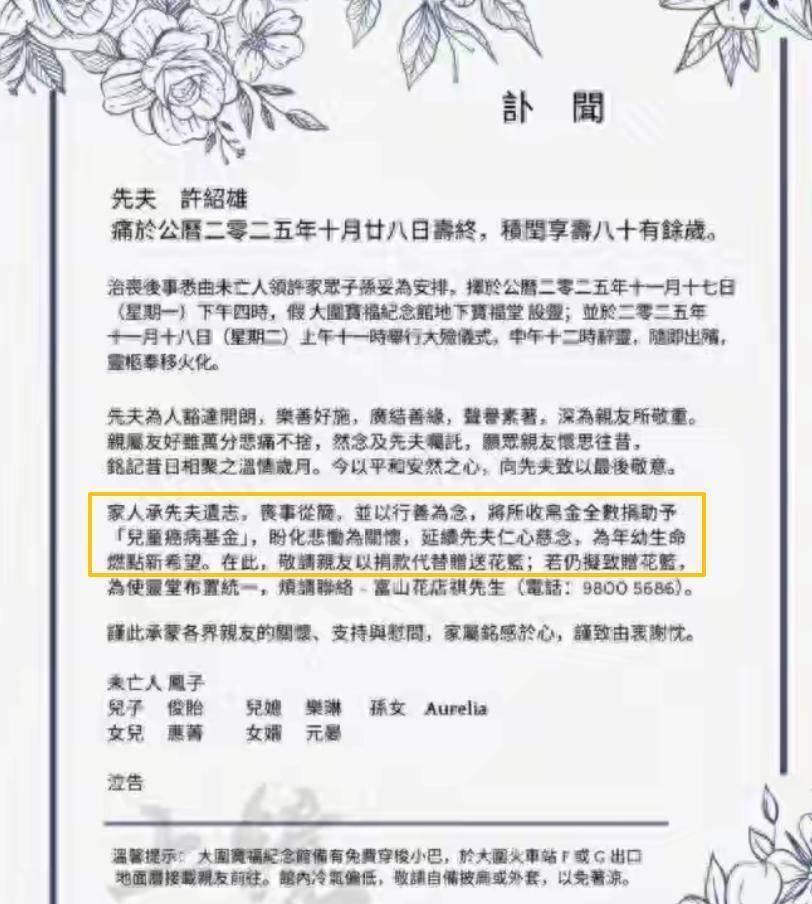 其实家属发布的讣告中就有写到,把柄许绍雄遗愿凶事纯粹,况且要将通盘的帛金全部捐助给“儿童癌症基金”,是以讣告中但愿亲一又们不要送花篮,而是把花篮钱该为捐钱代替。
