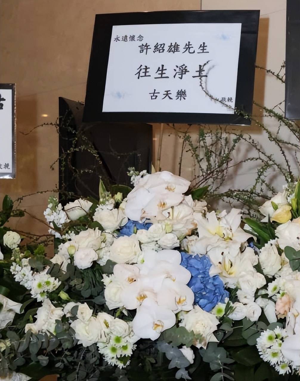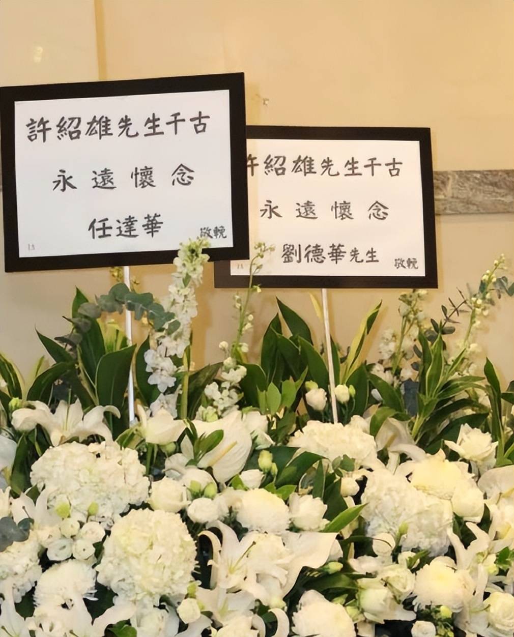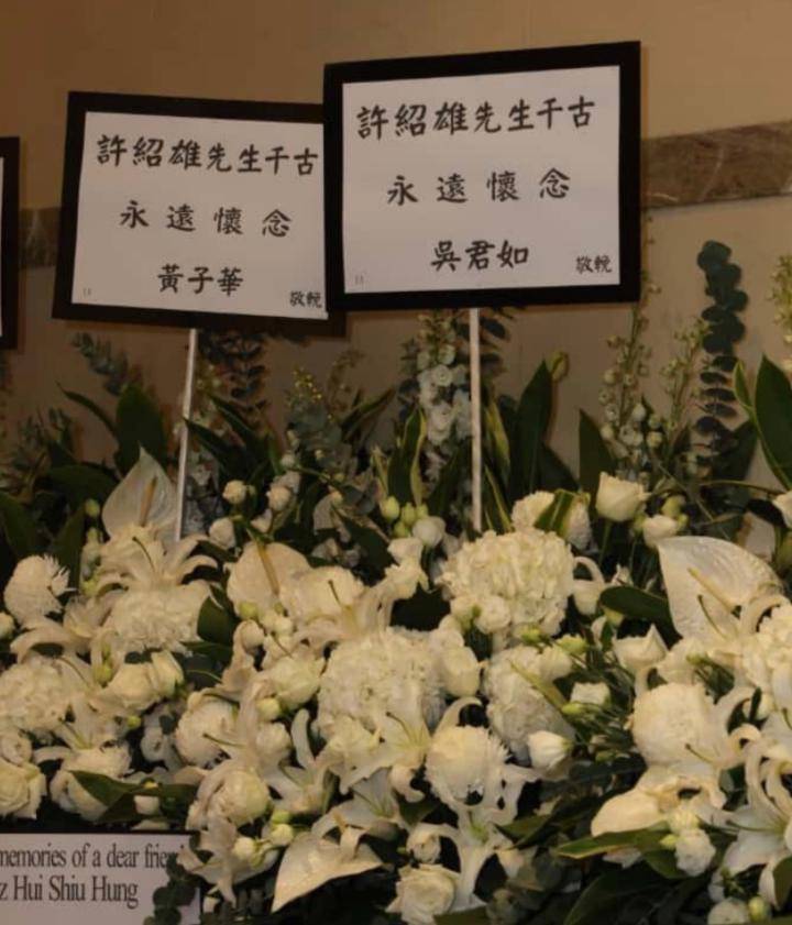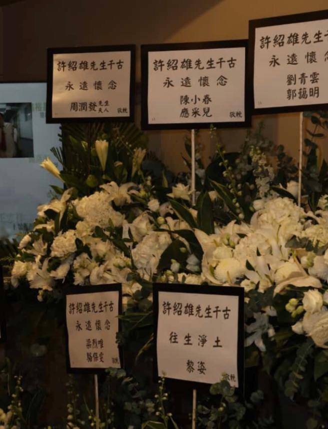 总之,许绍雄的灵堂充满了氛围感,他那张经典的相片被用作遗照,四周围满了白色鲜花,遗照上方挂有四个大字“永久怀念”,下方摆放着一个宏大的香炉和烛炬,圈内好友们的花圈被摆放在两侧,高等又持重。