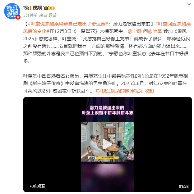 近日,在《全部似锦》未播花絮中,62岁的叶童与宁静敞甘心扉。这位刚刚在《乘风2025》成团夜斩获冠军的演员坦言,节目“把我有一方面的那种厚谊,还有那方面的智商逼出来”,而宁静也不禁惊叹叶童的情状比旧年节目中好了太多。
