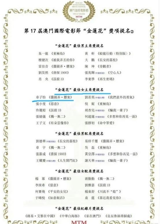 17. 这份专注很快成绩申诉。上月18日,澳门国外电影节公布最好女主角入围名单,章子怡凭作品班师赢得提名。