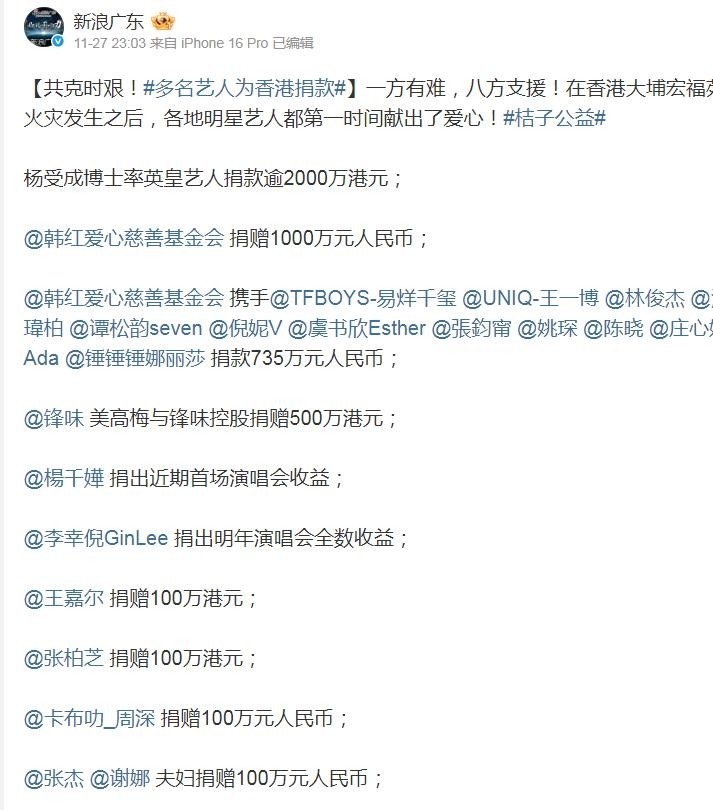 27. 前段时期香港突活气灾事故,多位艺东谈主纷纷晒出捐钱截图抒发关怀,关联话题接连登上热搜榜单。