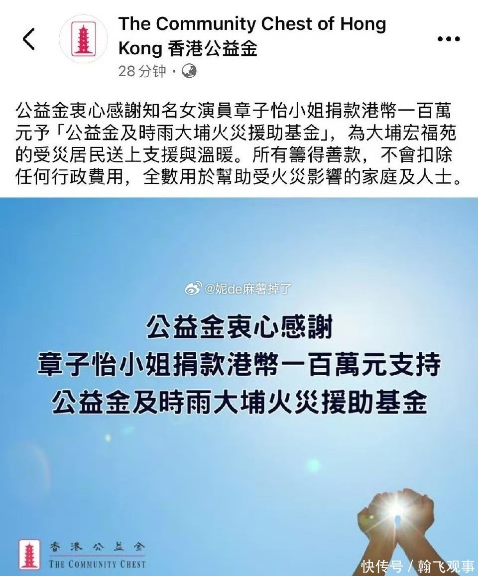 29. 直到香港公益金官方账号主动发文致谢,全球才得知她早已暗暗捐赠一百万元用于救济重建责任。