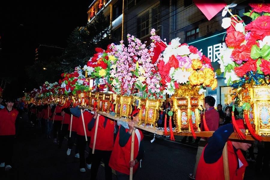 当晚七点半,巡游队列自上杭县政府认真动身。一盏盏匠心独运的花灯按次亮起,晴明流转。队列中,桶子灯与瓶子灯两种传统造型交相衬映,每块长约1.5米的条凳形木板上各置两盏花灯。花灯表里三层以花篮模式计算,中间饰以