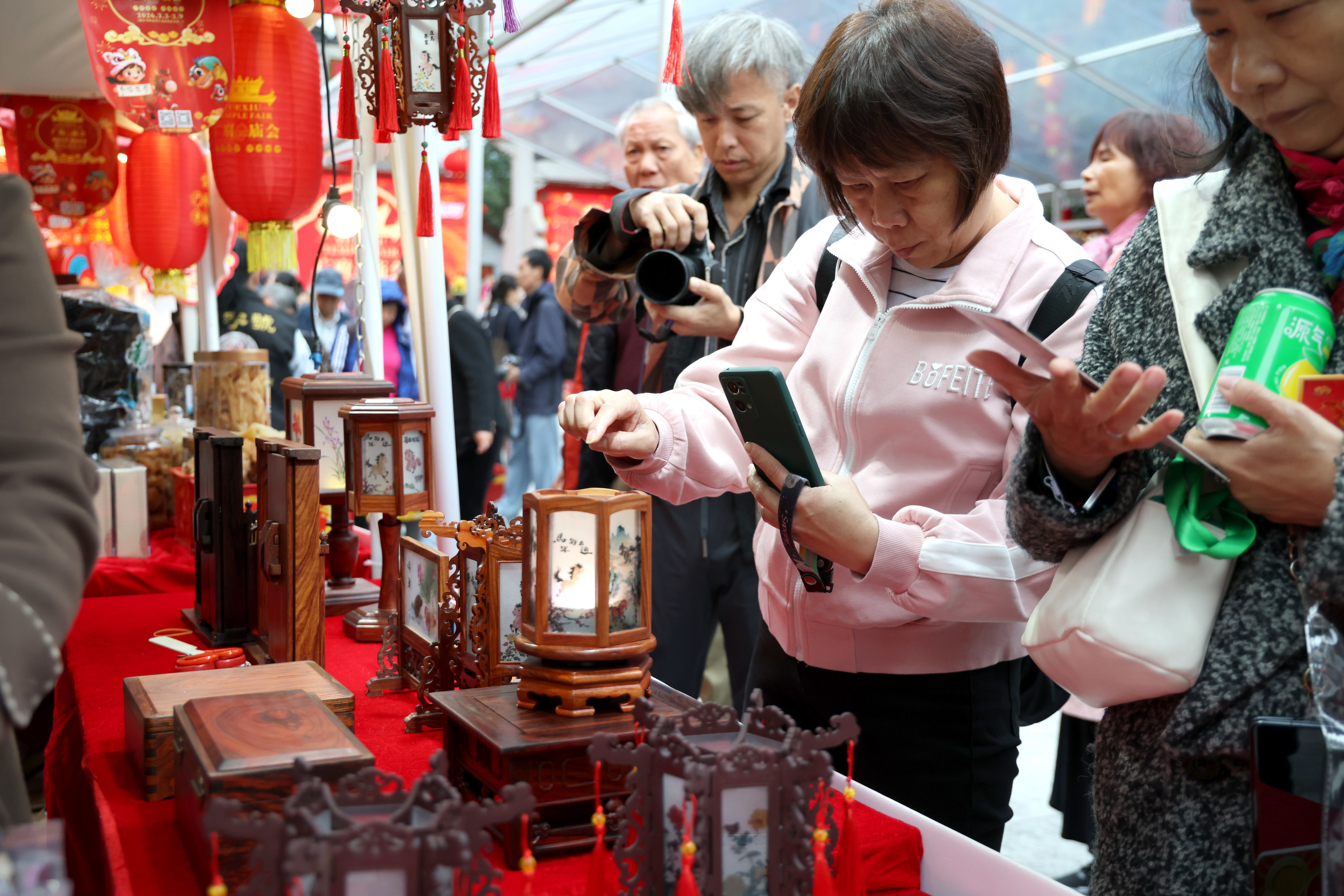 3月3日,以“古城惟新,三脉绵延”为主题的2026广府庙会在广州开幕。市民在广府庙会上拍摄、选购广彩花灯。