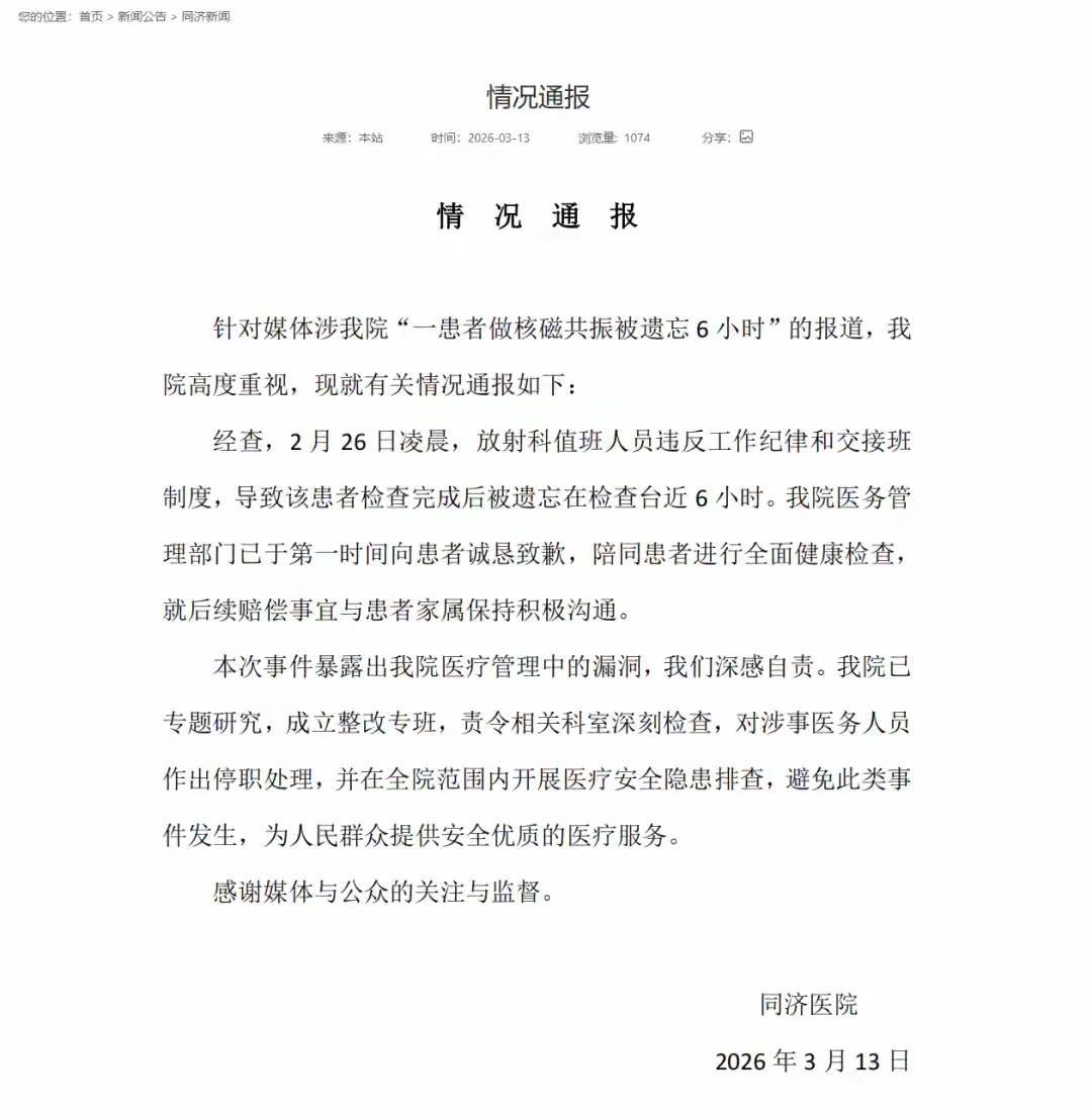 3月13日,华中科技大学同济医学院附庸同济病院官网就此事发布情况通报:经查,2月26日凌晨,辐照科值班东谈主员违抗责任纪律和交交班轨制,导致该患者查验完成后被淡忘在查验台近6小时。病院医务解决部门已于第一本事向患者教悔致歉,伴随患者进行全面健康查验,并就后续补偿事宜与患者家属保合手积极不异。
