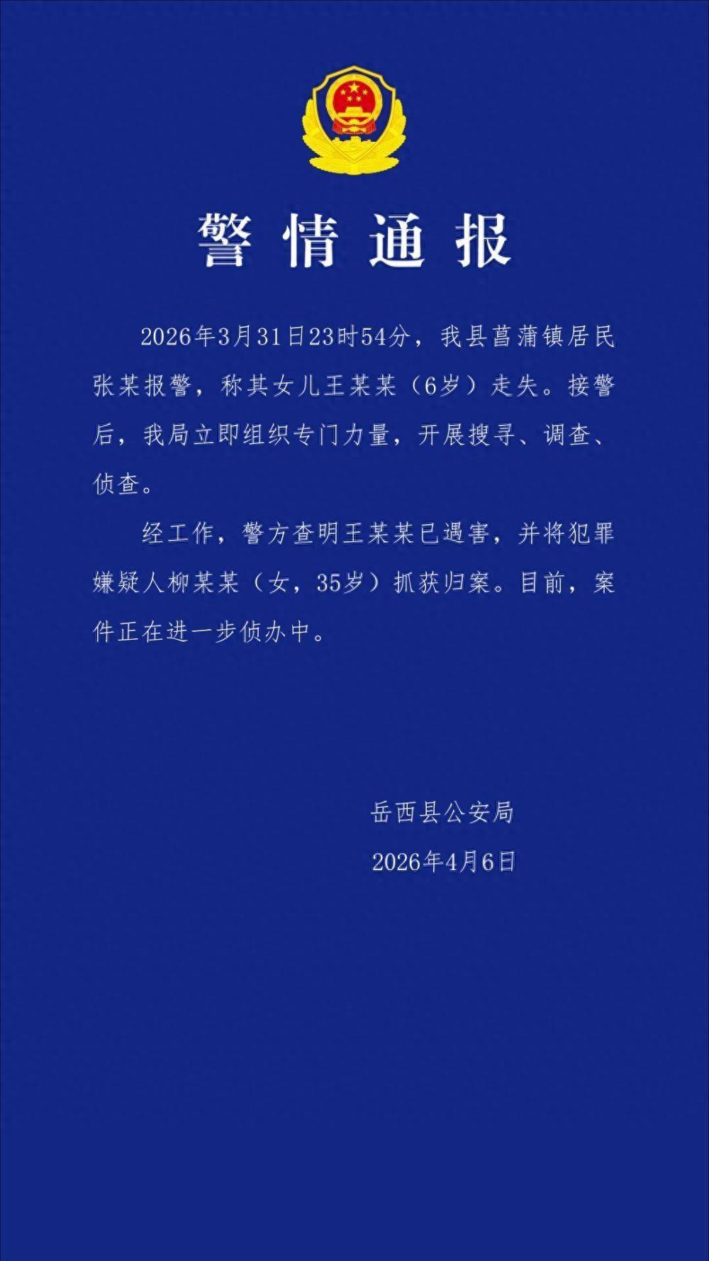 2026-04-104月6日开云体育,安徽岳西县公安局发布警情通报:又名6岁失联女童阐述罹难,犯警嫌疑东谈主已归案。 (央视新闻)开云体育