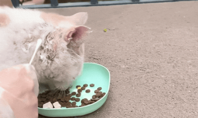 她决定不可坐视无论,先柔和地把猫咪头上的脏东西擦了又擦,接着又去宠物药店买了些药品,运筹帷幄一边把它喂胖,一边帮它调理,给它取了名字“爆米花”。