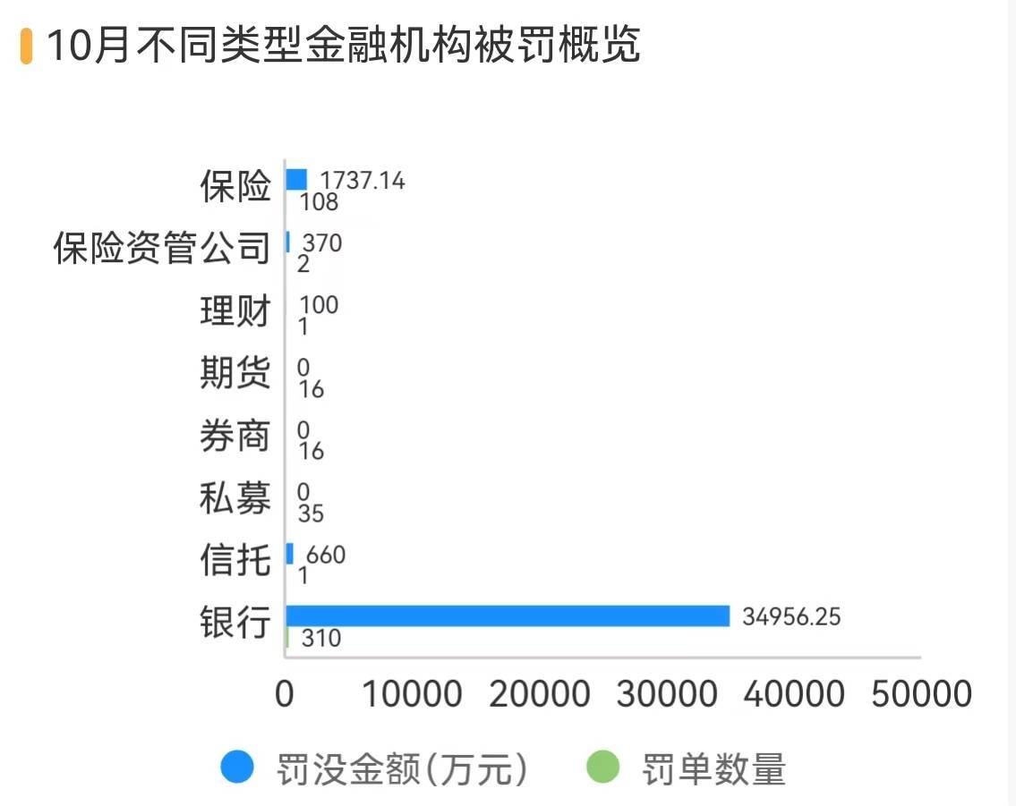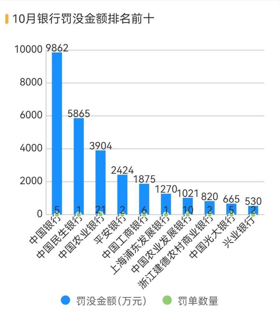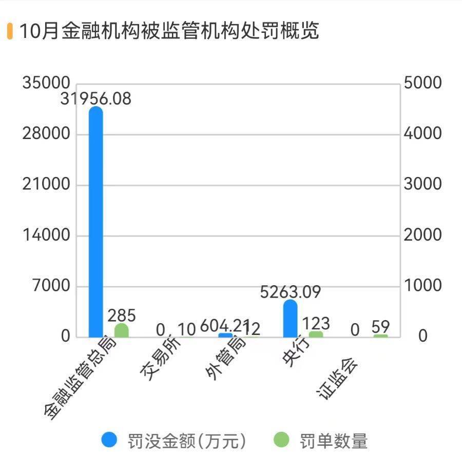 10月国度金融监督不休总局、央行、证监会、外管局开的罚单数目均有所减少。