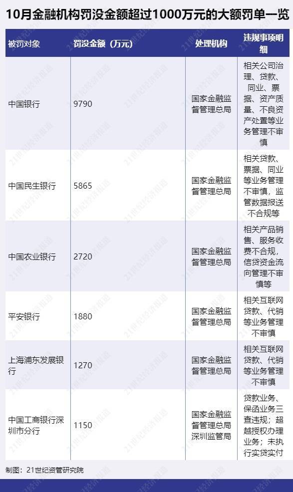 10月金融机构有6张罚单的罚没金额极度1000万元,收到10月最大罚单银行主要作歹违法行径为干系公司治理、贷款、同行、单据、钞票质料、不良钞票措置等业务不休不审慎。