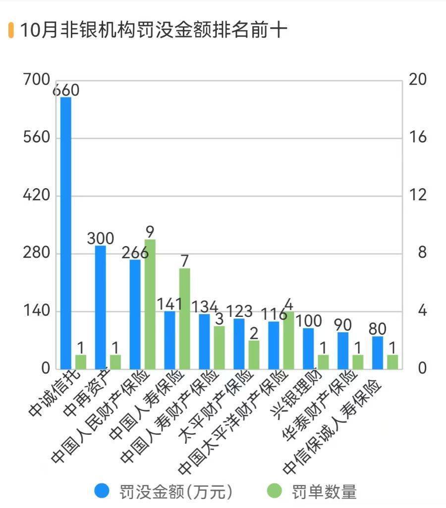 10月罚没金额最多的非银机构为中诚信赖,中诚信赖亦然10月唯独被罚的信赖公司。中诚信赖10月收到一张罚金660万元的罚单,主要作歹违法行径包括及格投资者东说念主数冲破“资管新规”要求、部分高档不休东说念主员未经任职经历核准提前履职、部分风险神气未纳入或未实时纳入风险神气身分表、以投资永续债权的样式变相开展融资类业务等。