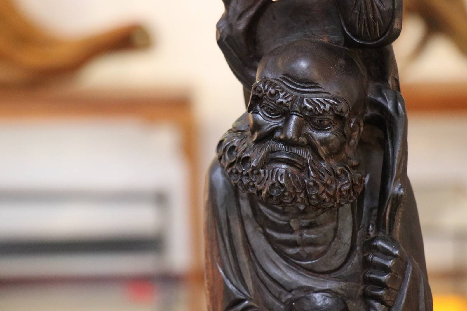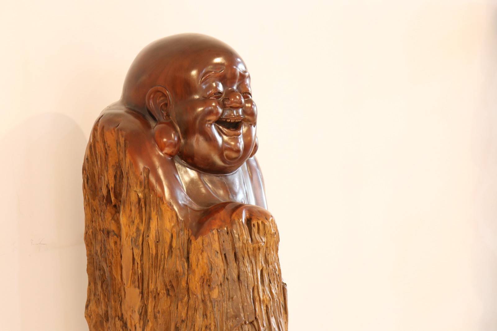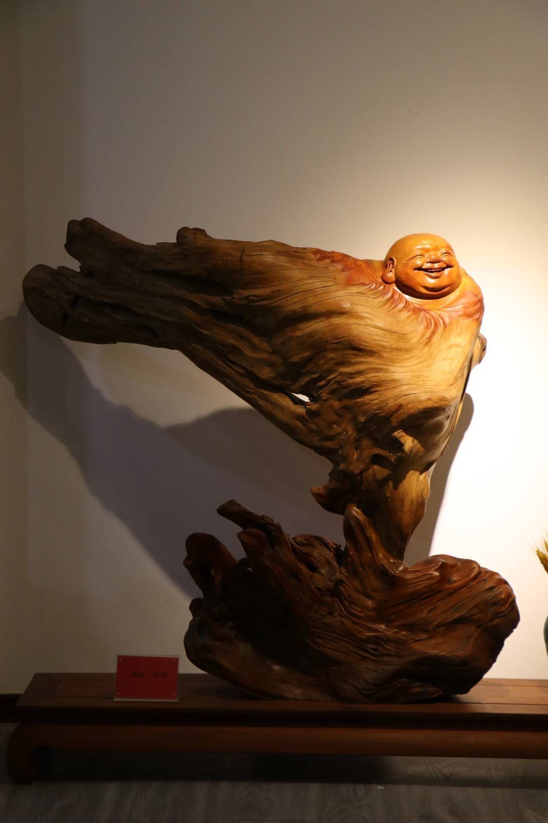 他的作品里,藏着传统的温度。《福星高照 南山之寿》里的弥勒佛,法衣不是刻出来的,而是顺着树根的自然纹理“长”出来的—— 既像大海翻涌的浪,又像行书里的“山”字,最妙的是弥勒佛死后,自然裹着一块“根抱石”,像是老天挑升为作品添的一笔。“这块材料我放了三年,直到某天看见阳光照在上头,倏得就意象‘佛伴山石’的境界。”