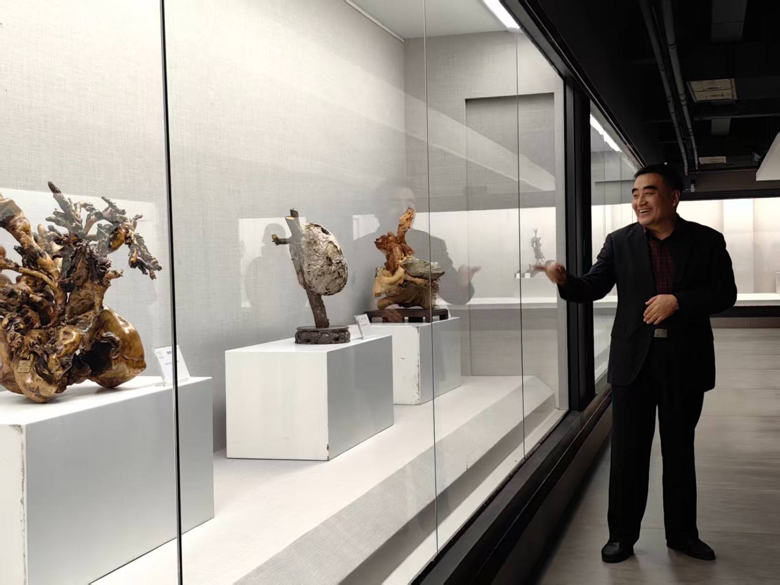 9月的山东工艺好意思术学院艺术馆里,一缕阳光斜斜落在根木作品上,纹理间仿佛藏着岁月的呼吸。《岁月峥嵘 根木为怀》展览刚开馆不久,就围满了立足的师生——有东谈主指尖轻轻拂过作品边际,有东谈主举入部下手机记载细节,而东谈主群中,一位每每为不雅众西席的身影,恰是这场展览的主角,亦然山海天根木艺术非遗代表性传承东谈主沈永明。